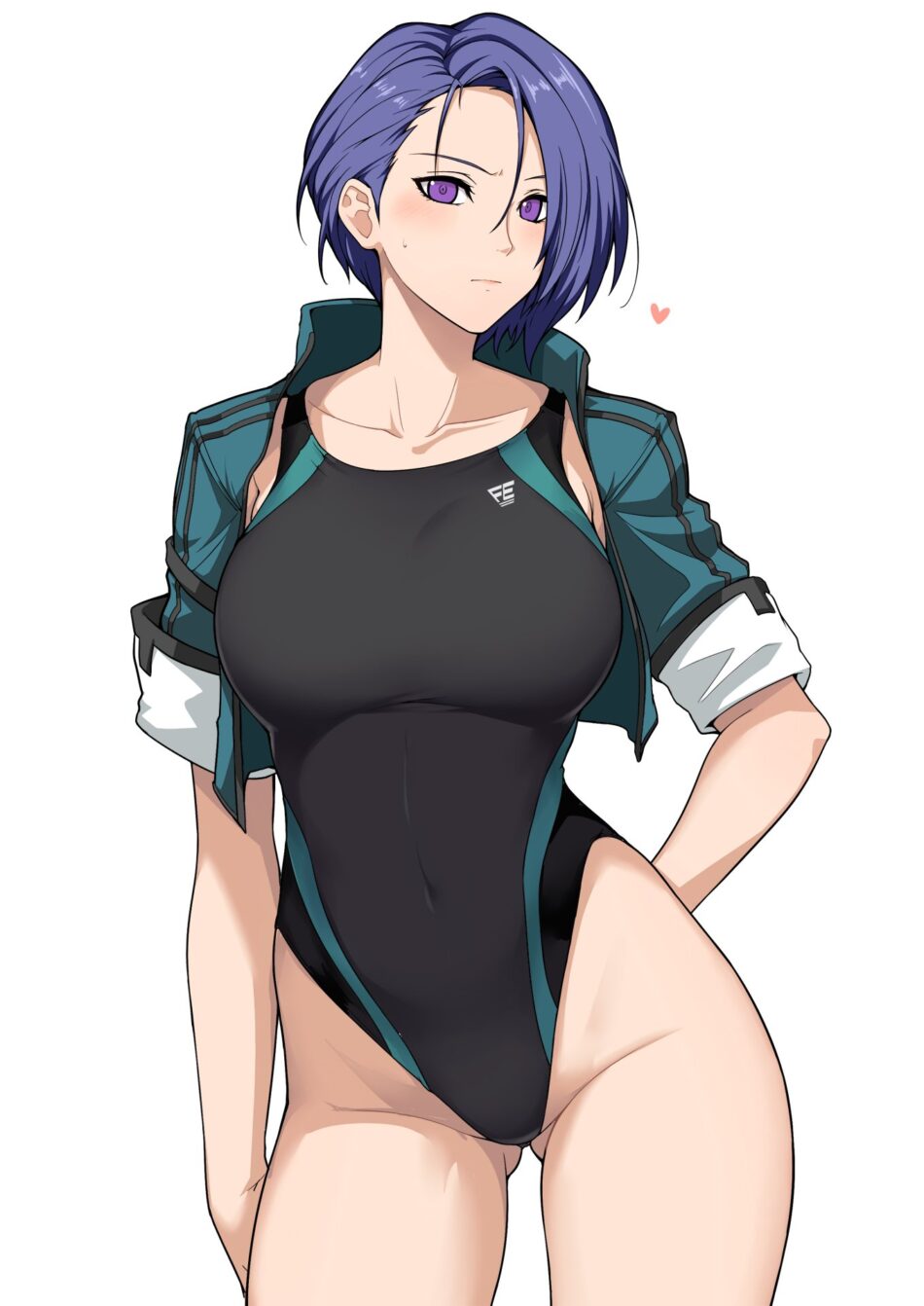 Hentai Busty – 1girl alluring asymmetrical hair big breasts black one-piece swimsuit blue